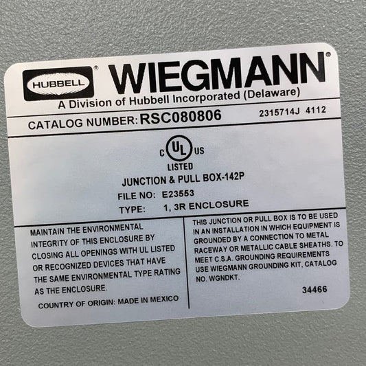 New Hubbell Wiegmann RSC080806 Metal Junction & Pull Box 1,3R Enclosure