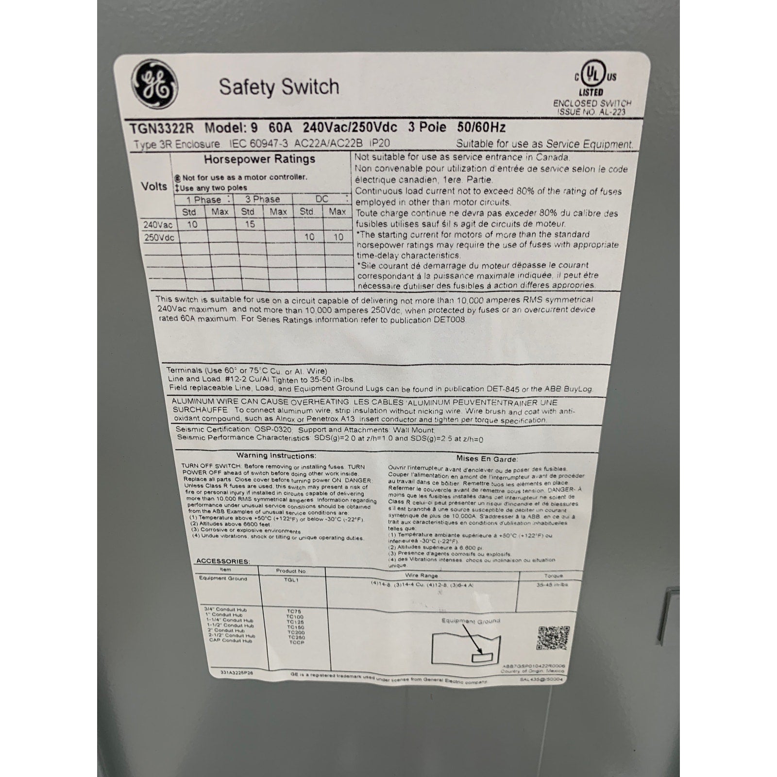 ABB TGN3322R General Duty Safety Switch 60A Non-fusible 3 Pole 240VAC / 250VDC