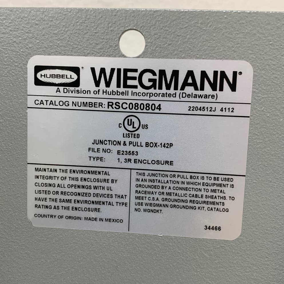 Hubbell Wiegmann RSC080804 Metal Junction & Pull Box 1,3R Enclosure VG Condition
