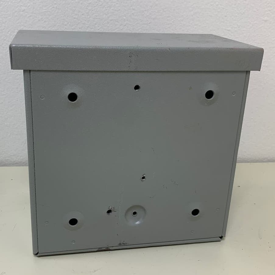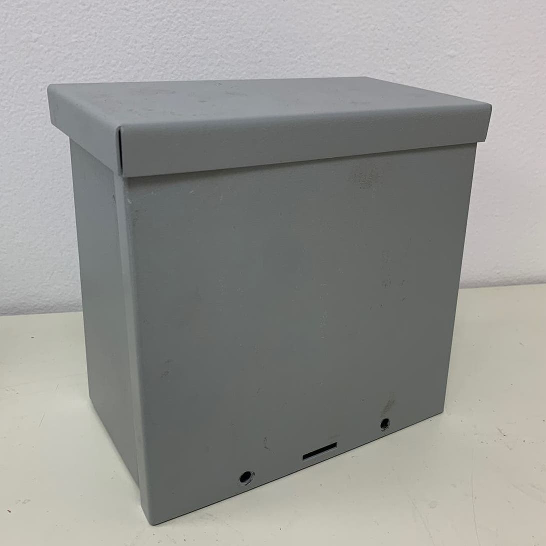 This junction box is in very good condition, measures 8" by 8" by 4.5".