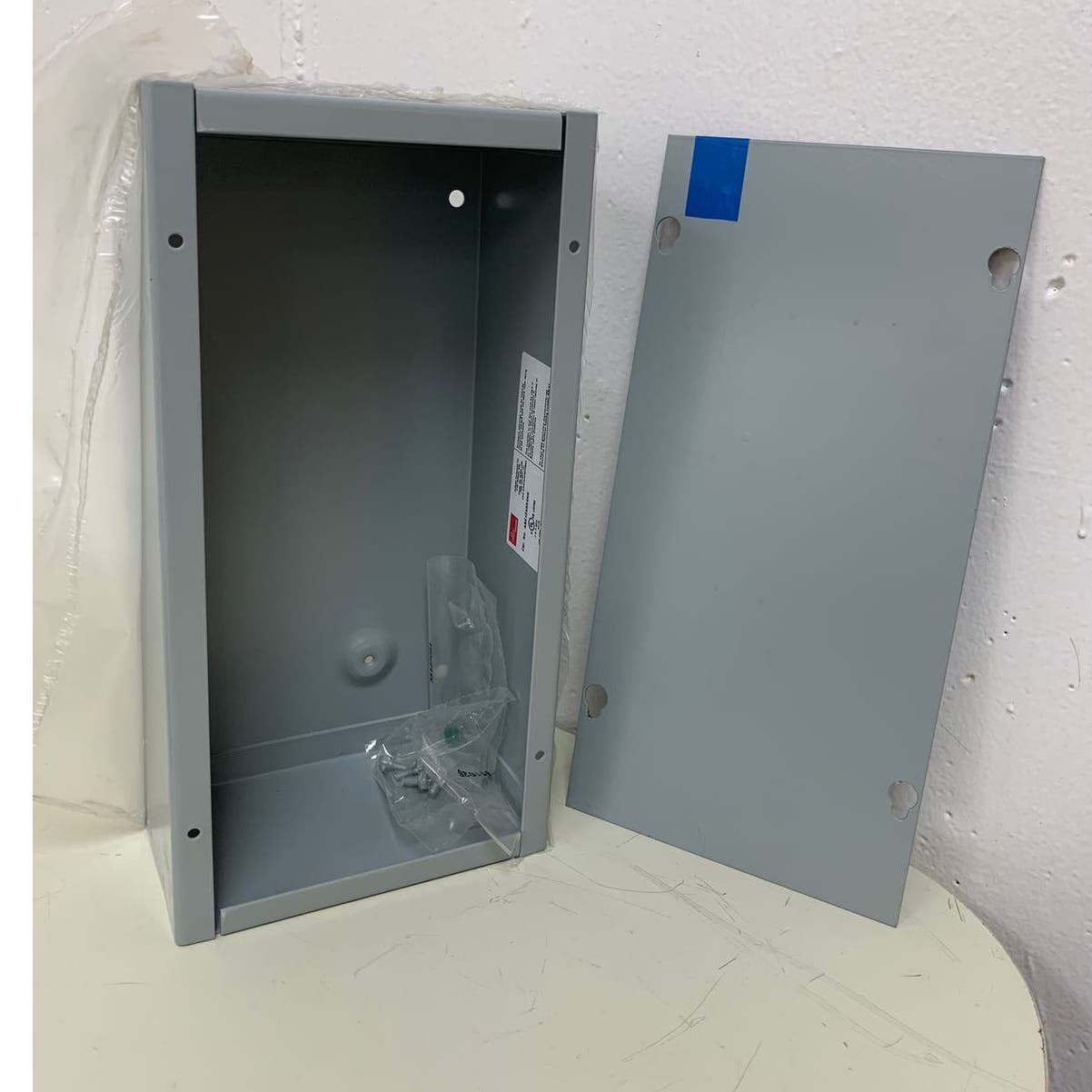 This junction box is new in its original plastic, measures 12" by 6" by 4".