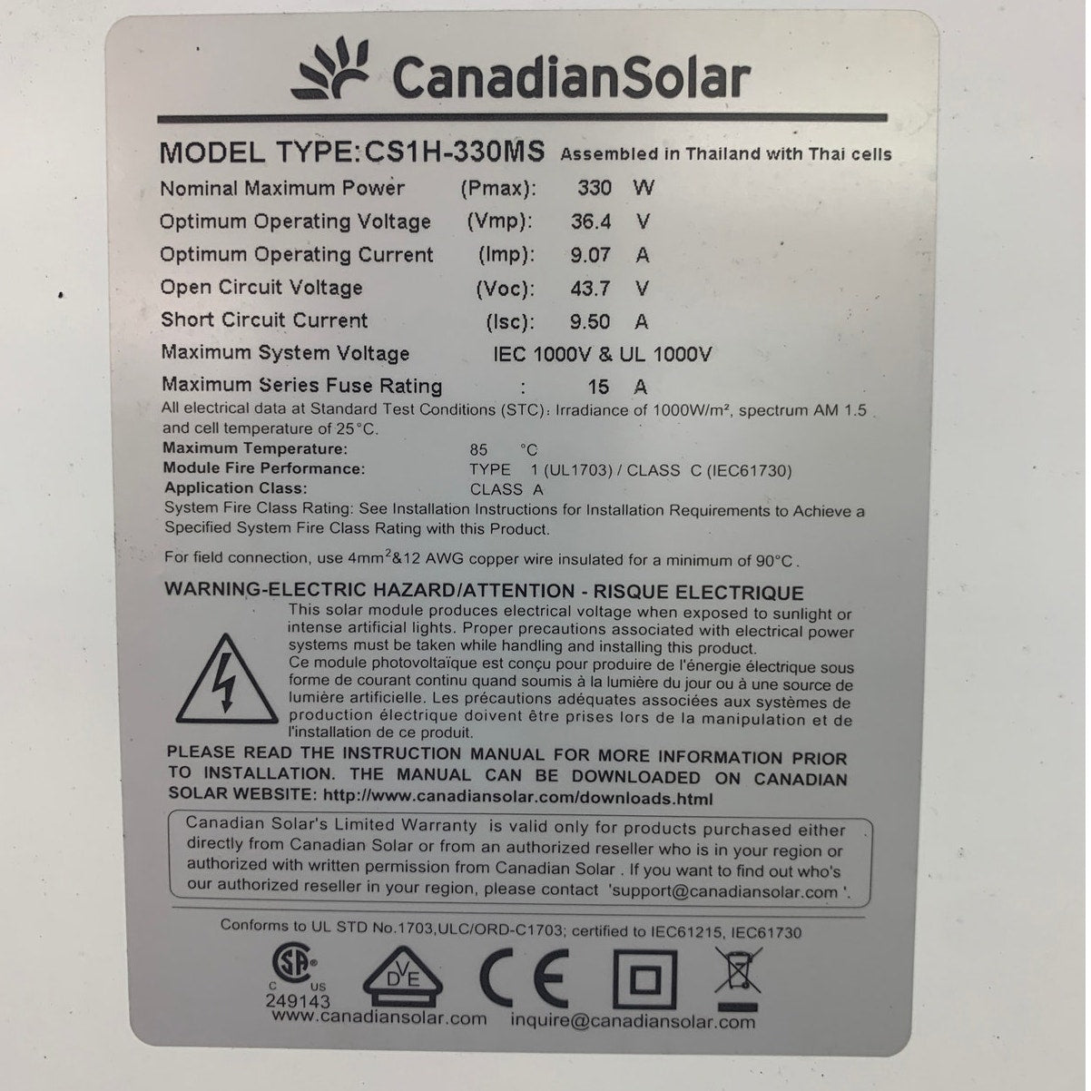 Used Canadian Solar CS1H-330MS Black on Black 330W Solar Panel Module