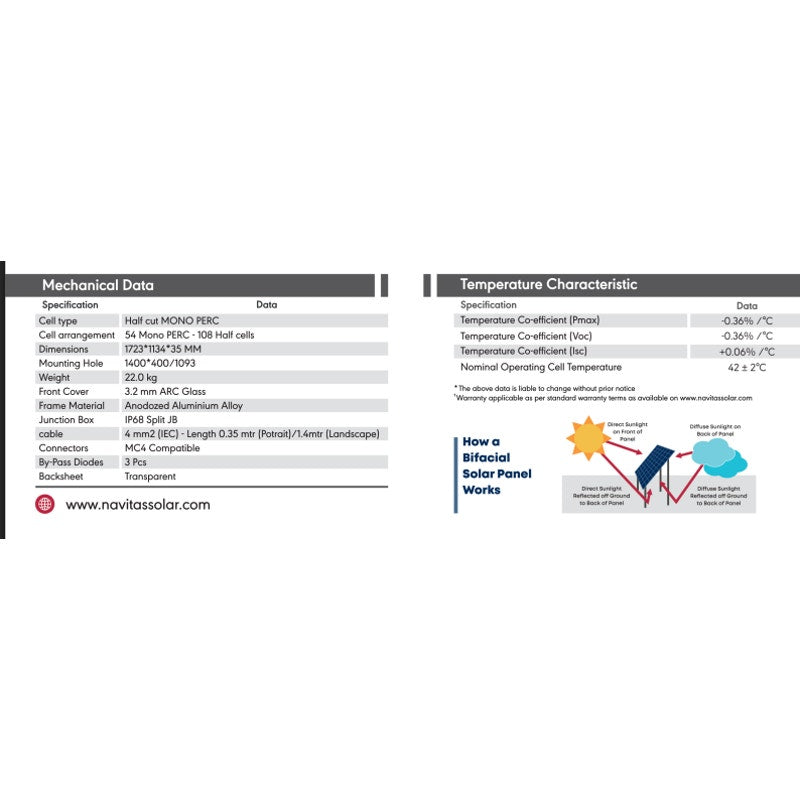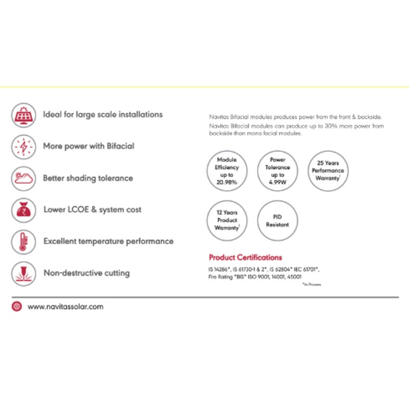 Elevate your solar energy solutions with the Navitas 410W Bifacial Black Mono PERC Half Cut Module. This advanced solar panel features a 108-cell design that ensures optimal energy conversion and performance. With its sleek black color, it seamlessly integrates into any residential or commercial setting, offering a sophisticated aesthetic in addition to environmental benefits. Crafted for efficiency, the Navitas brand is synonymous with quality and durability. This solar panel is engineered to withstand the rigors of daily exposure to the elements, ensuring long-lasting power generation. Whether you're looking to offset your energy costs or contribute to a sustainable future, this solar panel is a reliable choice for your energy needs.