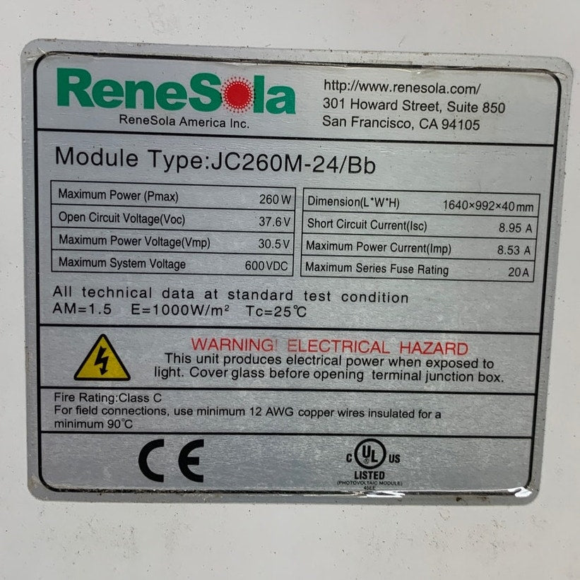 Used ReneSola 260W JC260M-24/Bb Blue Polycrystalline 60-Cell Solar Panel Module